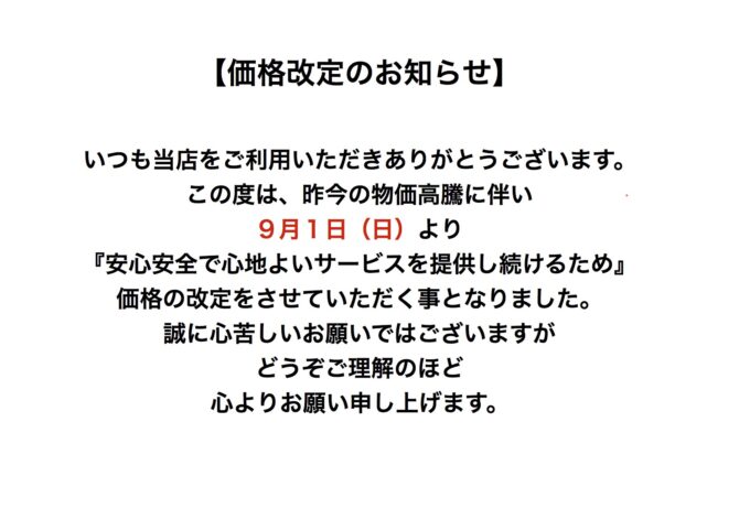ホームお知らせ 料金改定のお知らせ 2024年8月1日 SHARE ツイート シェア はてブ LINE Pocket 新料金 大人カット5400円〜 高校生カット4900円 中学生カット4400円 子供カット3500円 ご理解ご協力の程よろしくお願い致します。