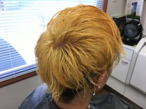 ブリーチ剤を使って髪の毛の色を脱色していきます